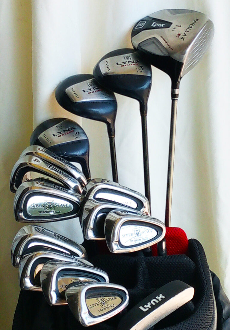Complete set of Lynx golf clubs in bag.