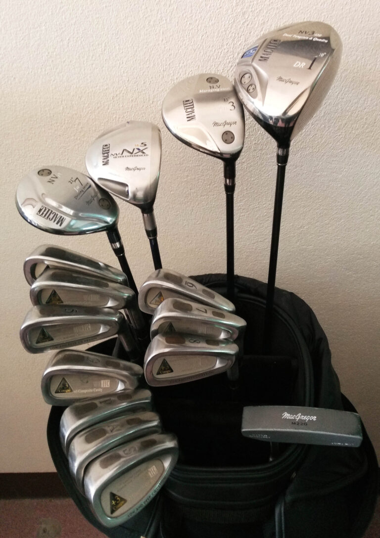Complete set of MacGregor golf clubs in bag.